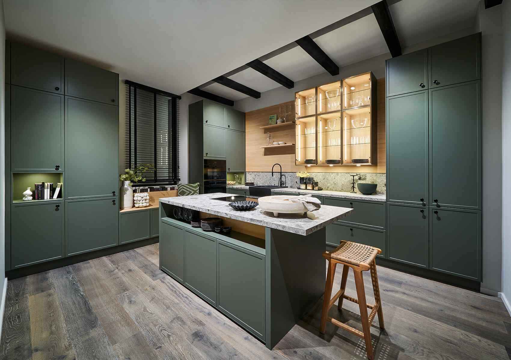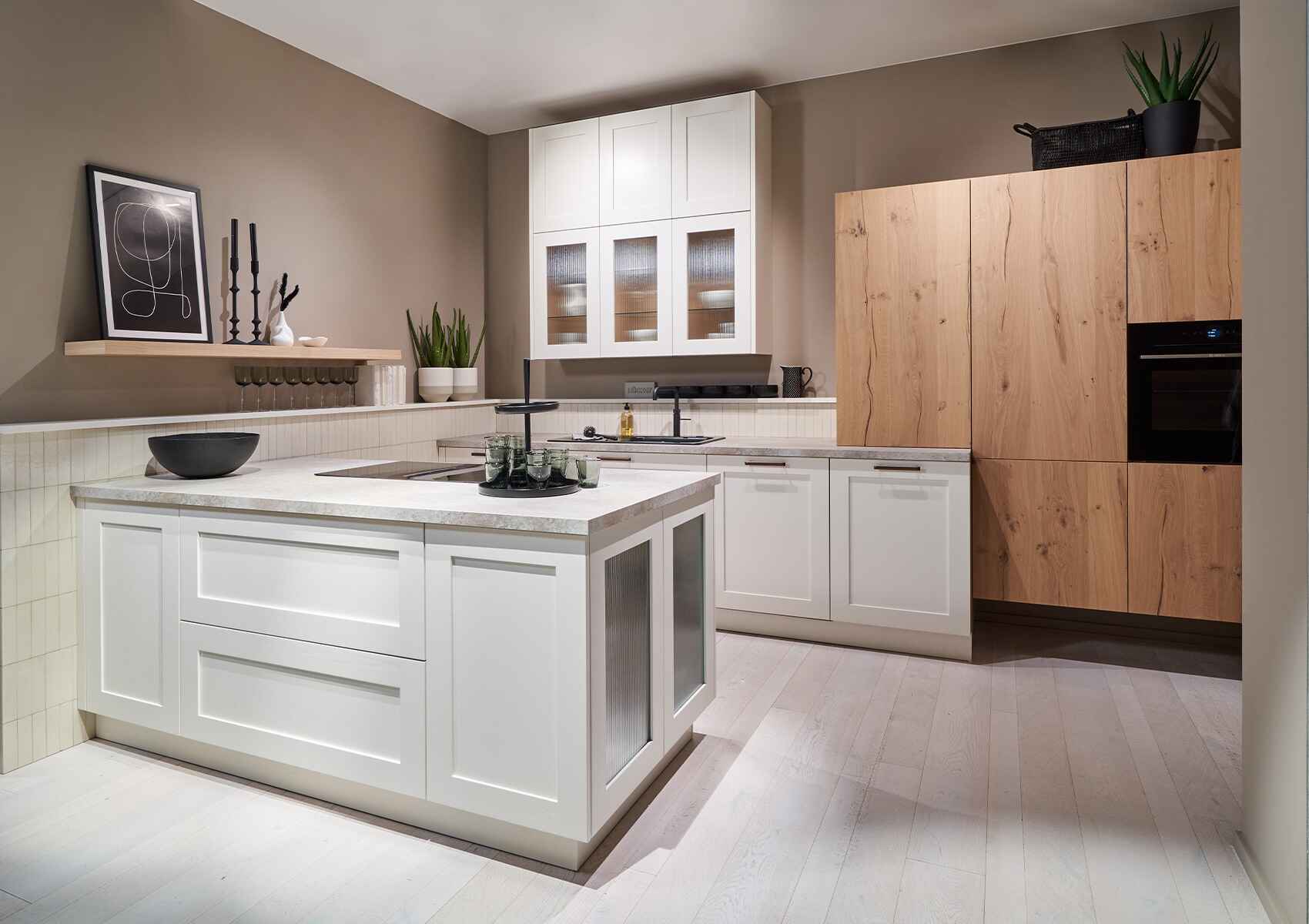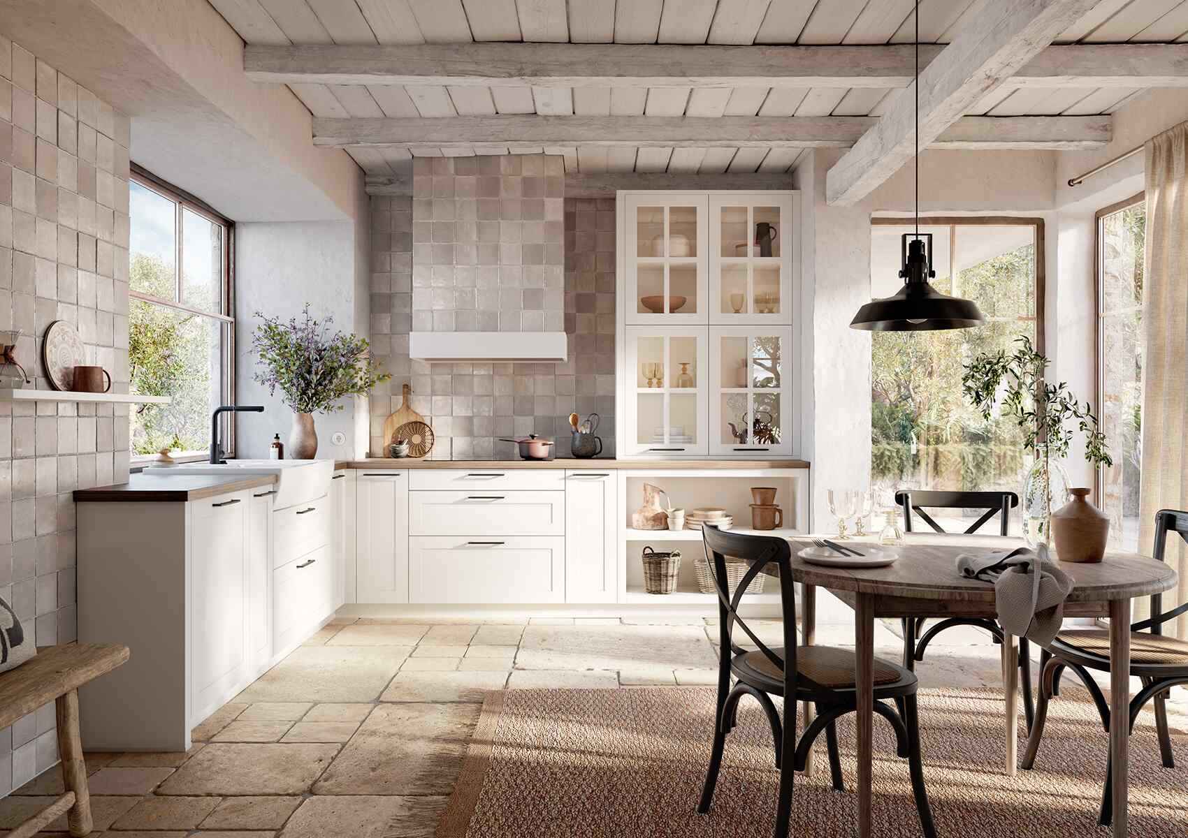 Die klassischen Fronten, oft verziert mit Rahmen oder Kassetten, vermitteln einen rustikalen Charme, während sanfte Farben wie Creme, Pastell oder Erdtöne das Gesamtbild abrunden.